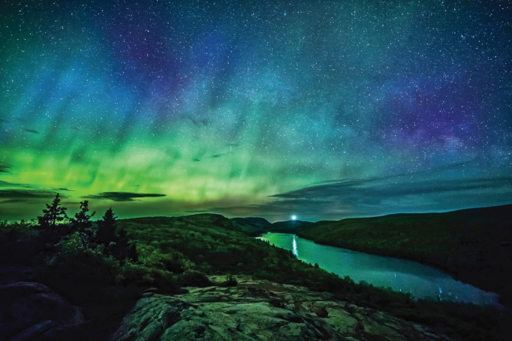The Upper Peninsula is blessed with hundreds of miles of shoreline along the south shore of Lake Superior, which provides some of the best northern lights viewing in the lower 48 due to the very dark night skies. When looking north over Lake Superior, one can see right down to the horizon and take in a 180-degree unobstructed view of the night sky. Having a dark night sky with little light pollution is necessary when looking for the northern lights, as the light of the aurora is equal to the brightness of starlight.